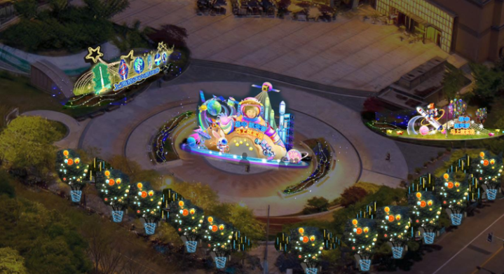 南广场则以“航天”为主题线索,构建“追星赶月”的叙事结构。“星河映征途,莘年皆坦途”以谐音方式完成祝福表达,也把“莘庄灯会”与“新年”关联起来。在灯组语境里,航天不再只是科普元素,而成为一种城市精神的象征:向上、远行、探索。